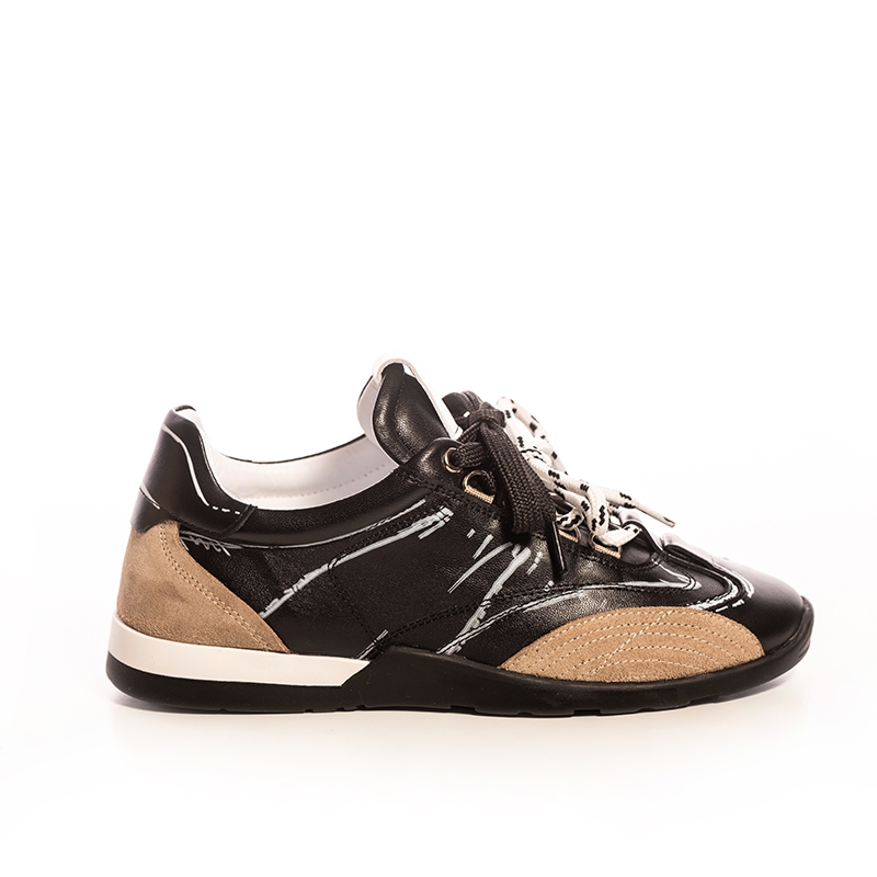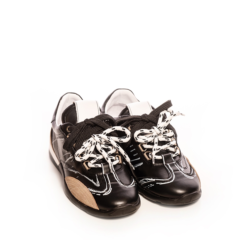 These fashion sneakers feature a modern silhouette with unique design elements. The combination of black leather with contrasting accents creates a visually appealing look that complements a variety of outfits. Wear them with jeans, shorts, or even dress pants for a versatile style statement.