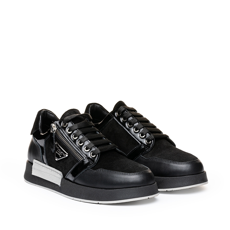 Acești adidași se remarcă prin designul lor sofisticat, cu detalii atent lucrate. Pielea neagră de calitate superioară este combinată cu accente lucioase, oferind un aspect luxos și atrăgător. Fermoarul lateral adaugă un plus de stil și originalitate, transformând acești adidași într-o piesă statement în garderoba ta.