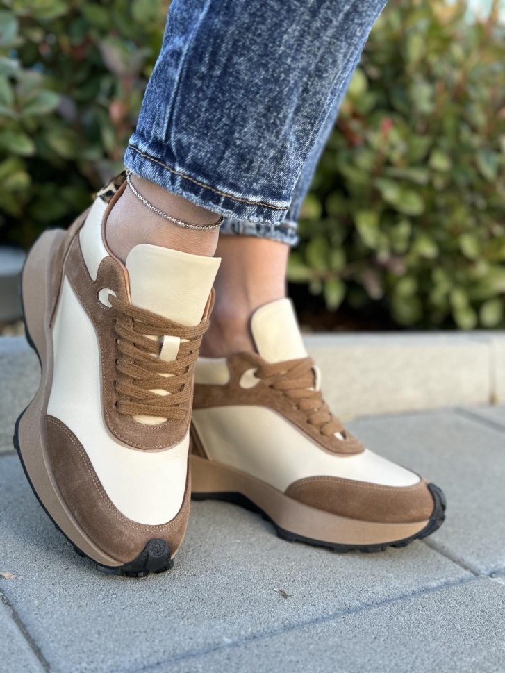 Acești adidași se remarcă prin designul lor sofisticat și atenția la detalii. Combinația de bej și accente de maro conferă un aspect elegant și versatil, ușor de asortat cu diverse ținute. Materialul principal este piele naturală de înaltă calitate, asigurând durabilitate și un aspect premium.