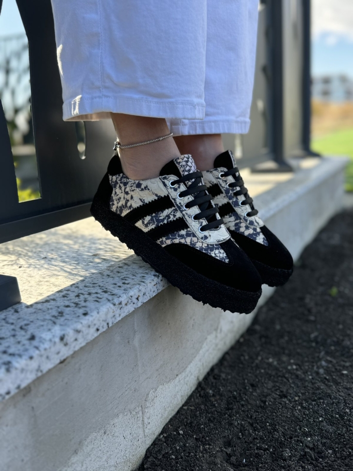 Acești adidași se remarcă prin combinația inedită de texturi și detalii. Partea frontală și cea din spate sunt realizate dintr-un material negru moale, care contrastează frumos cu imprimeul subtil de pe laterale. Cele trei dungi negre, emblematice, adaugă o notă clasică, în timp ce talpa neagră, ușor texturată, completează aspectul modern și urban.