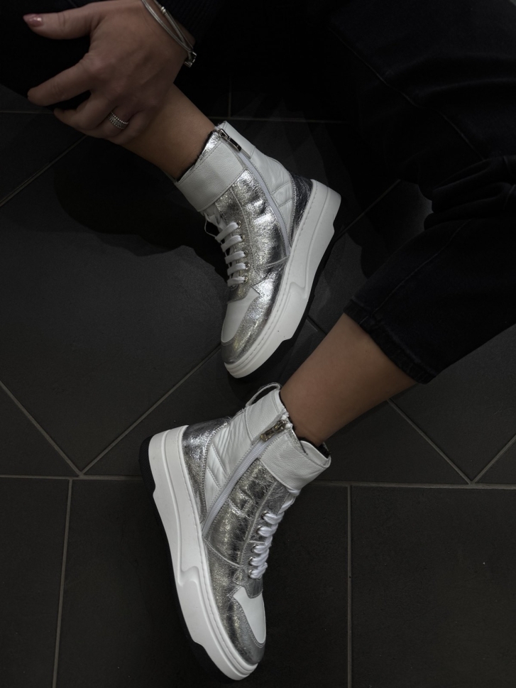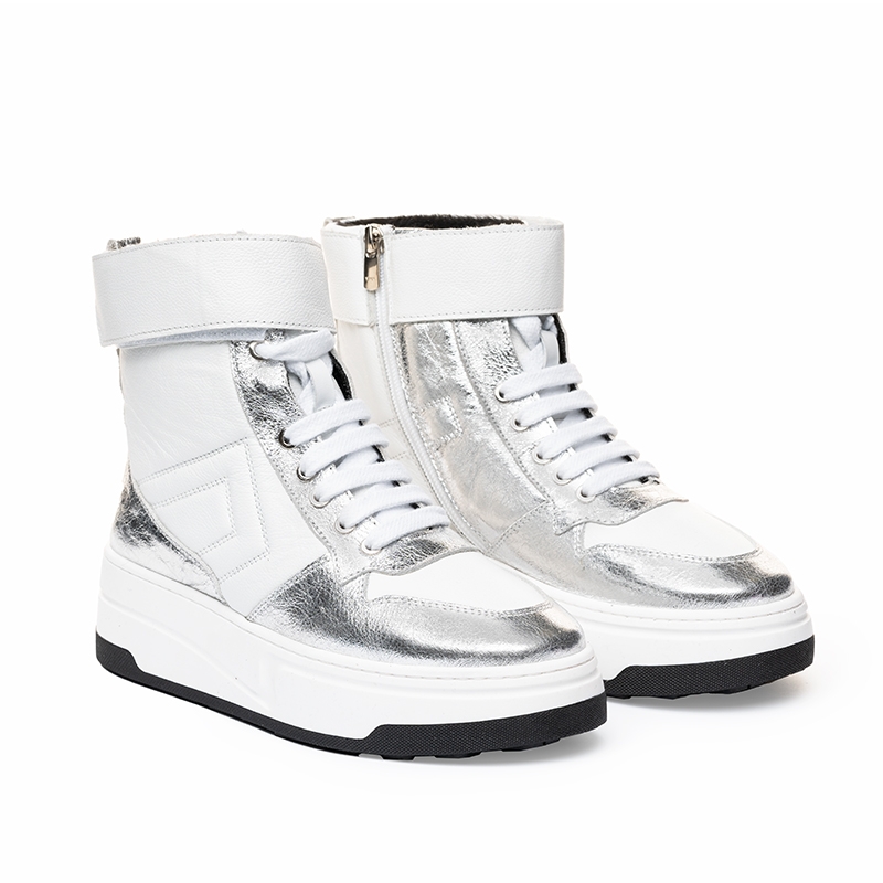 Ghetele sunt concepute pentru femeia modernă care nu se teme să iasă în evidență. Combinația dintre albul imaculat și argintiul metalizat creează un efect vizual captivant, ideal pentru a completa un look urban sofisticat.