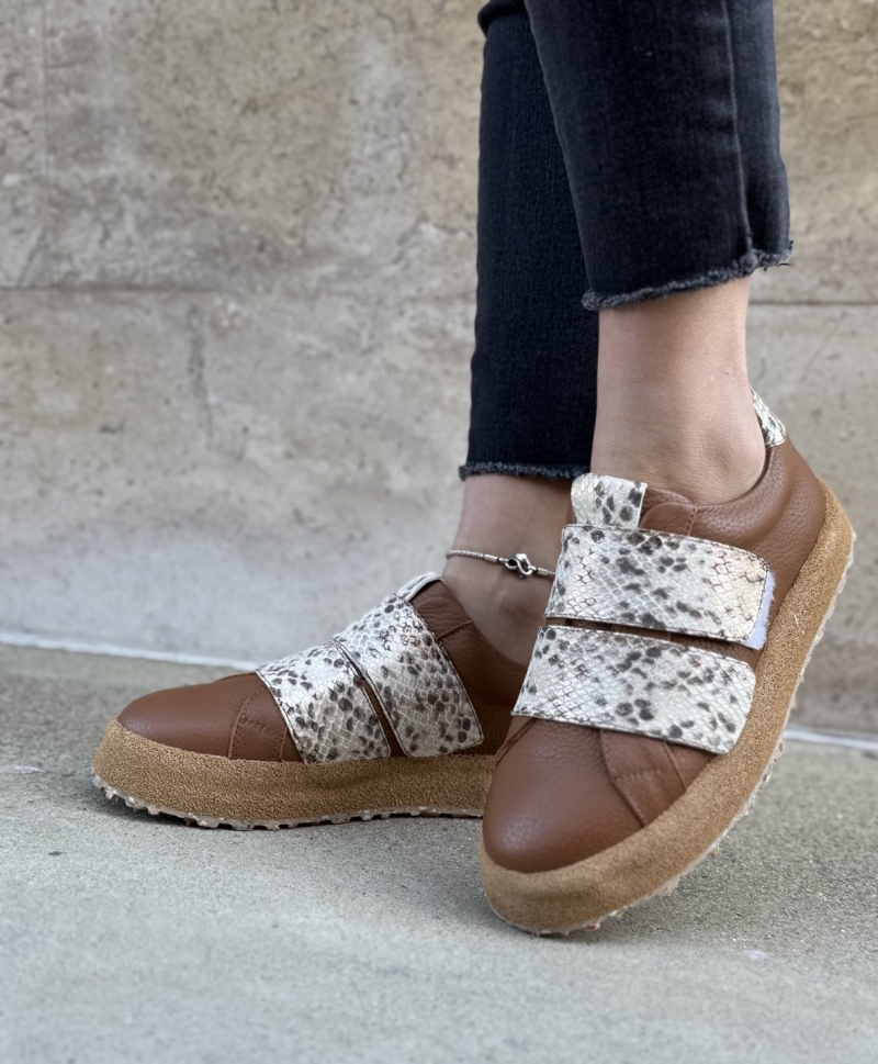 Design Inovator: Ceea ce face acești sneakers cu adevărat speciali este designul lor unic. Culoarea maro caldă a pielii este completată de detaliile cu imprimeu de reptilă, adăugând o notă îndrăzneață și sofisticată. Închiderea cu baretă dublă cu scai nu doar că asigură o fixare perfectă, dar oferă și un aspect modern și nonconformist.