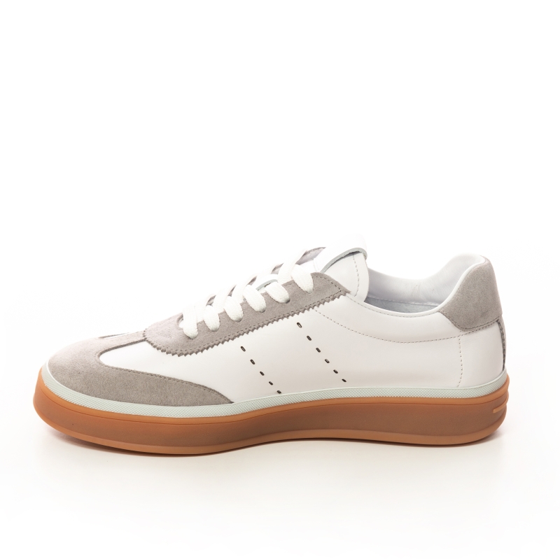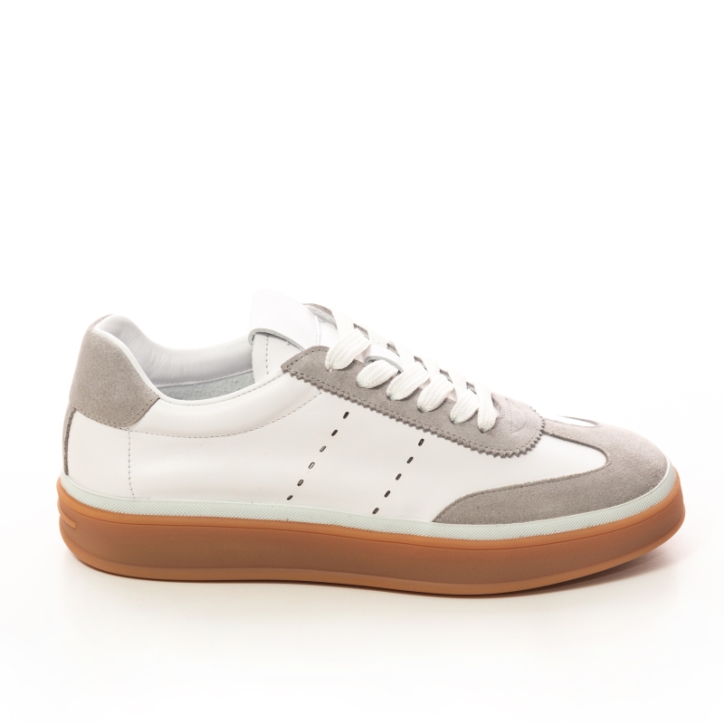 Eleganță desăvârșită cu acești teniși sport, combinația perfectă de piele albă și piele întoarsă gri. Un must-have pentru un look distins și confortabil.