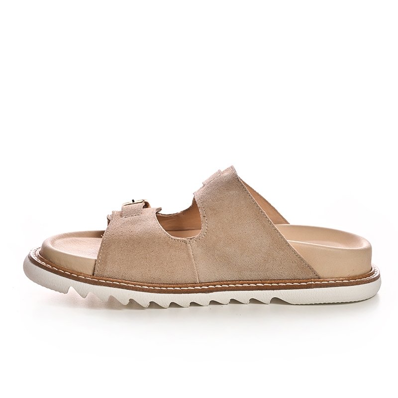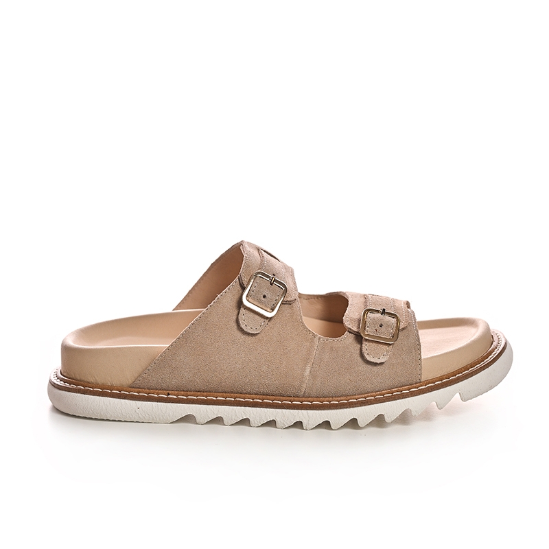 Șlapi damă piele întoarsă bej cu catarame - Confort & stil!
