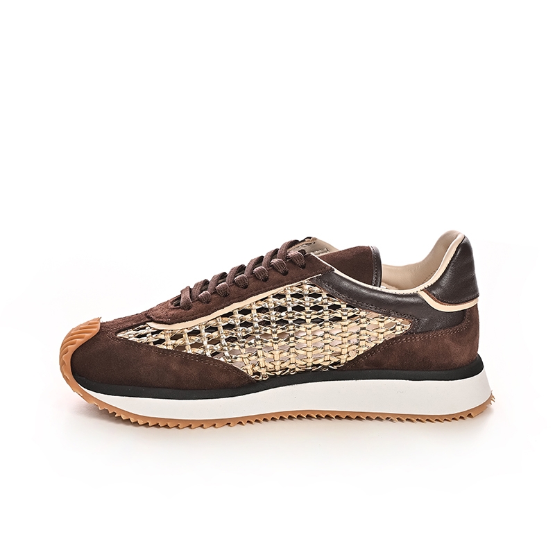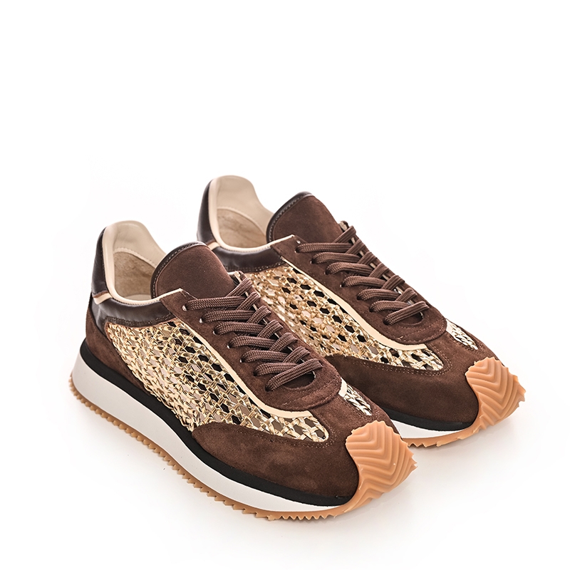 Sneakers-ii sunt confecționați dintr-o combinație rafinată de materiale, inclusiv piele naturală de înaltă calitate și inserții textile. Nuanța maro profundă este elegantă și ușor de asortat cu diverse ținute, de la cele casual, de zi, până la cele mai sofisticate. Partea laterală este decorată cu un model împletit distinctiv, care adaugă un plus de originalitate și textură.