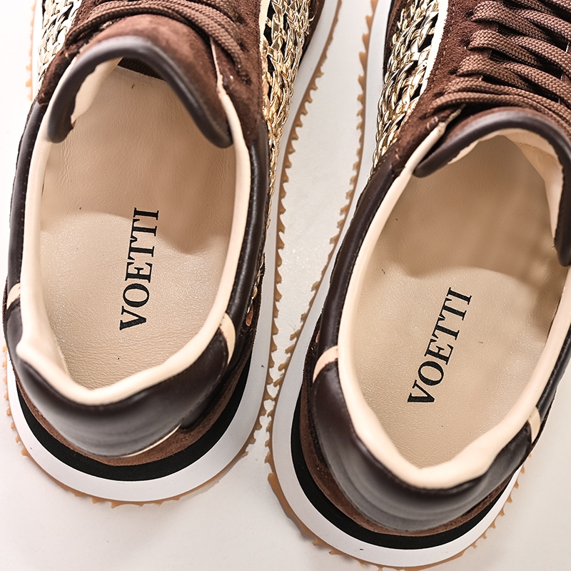 Fiecare detaliu a fost atent gândit pentru a oferi o experiență superioară. Șireturile rezistente asigură o fixare sigură și confortabilă. Logo-ul Voetti, discret plasat, atestă calitatea și autenticitatea produsului. Contrastul subtil dintre talpa albă și partea superioară maro accentuează designul modern al sneakers-ilor.