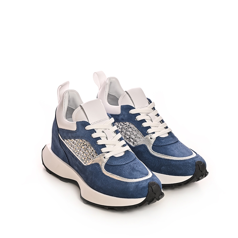 Confecționați din piele întoarsă de cea mai bună calitate, acești sneakers oferă o textură moale și plăcută la atingere, asigurând în același timp durabilitate și rezistență. Nuanța de albastru vibrant este accentuată de inserțiile argintii strălucitoare, care adaugă un plus de eleganță și un aer sofisticat. Detaliile albe din piele naturală completează designul, oferind un contrast vizual atrăgător.