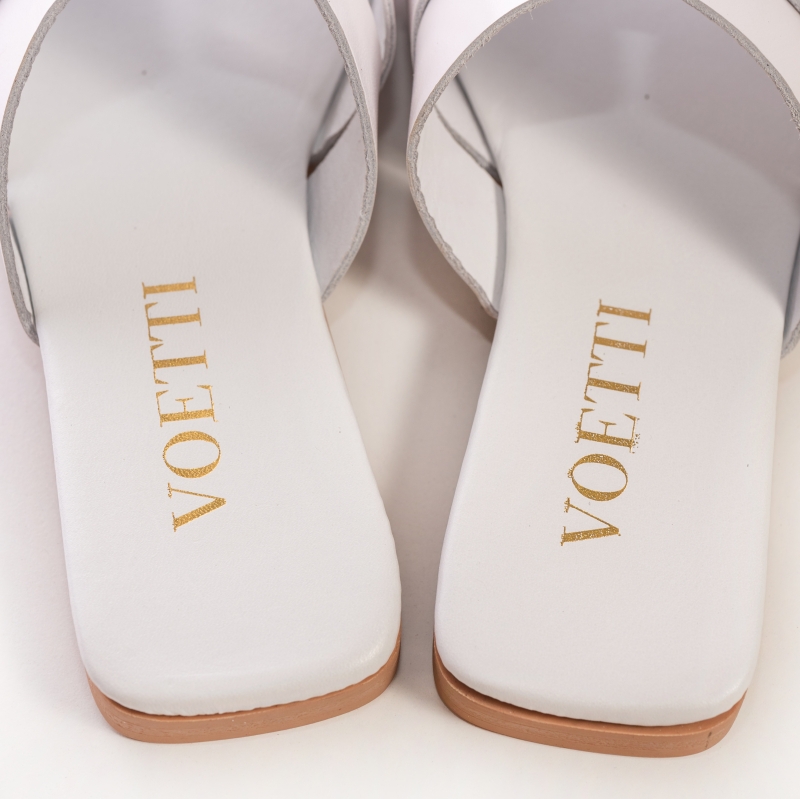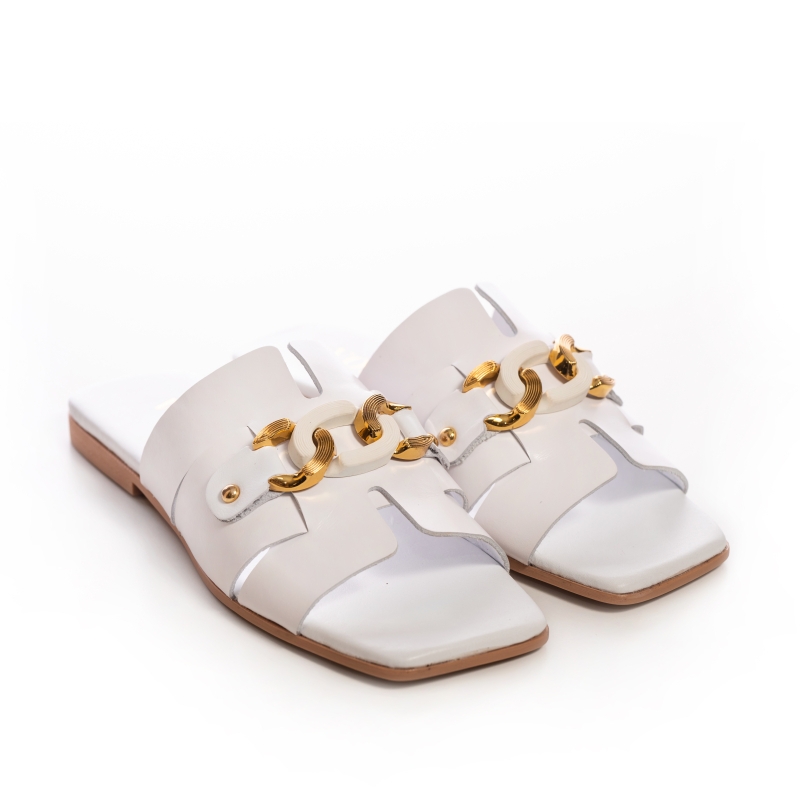 Acești papuci sunt realizați din piele naturală de cea mai bună calitate, oferind o senzație moale și plăcută la atingere. Designul alb imaculat este completat de un lanț auriu, adăugând o notă de rafinament și lux.