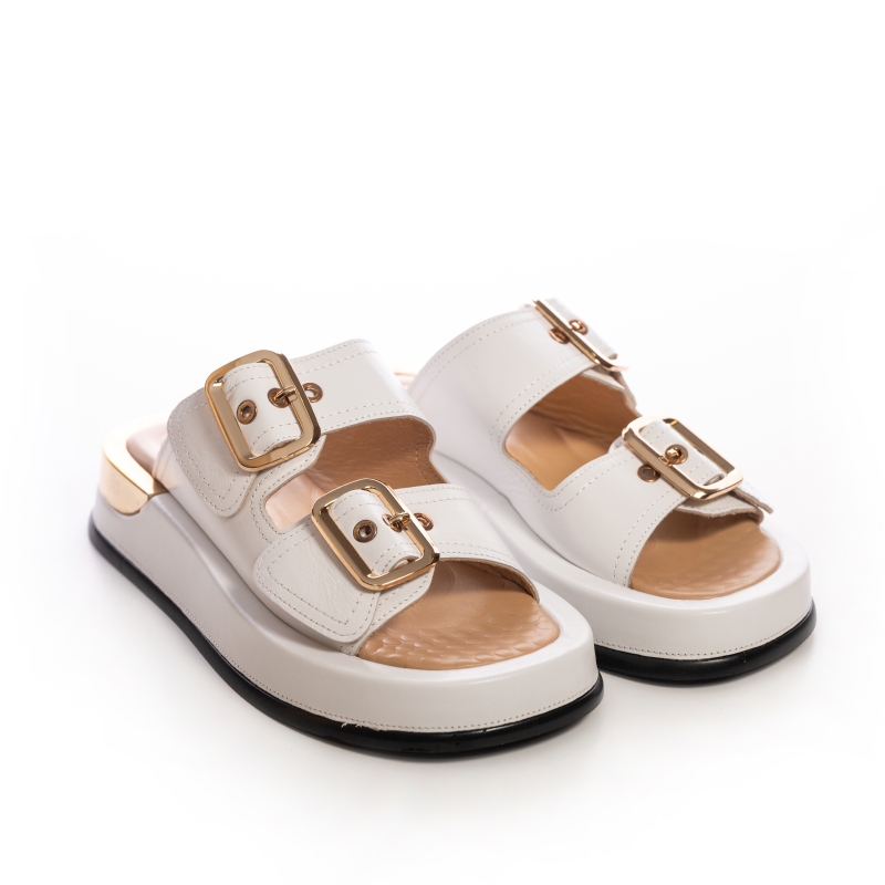 Acești șlapi sunt confecționați din piele naturală de culoare albă, oferind un aspect curat și sofisticat. Designul este accentuat de cataramele aurii, care adaugă o notă de lux și strălucire.