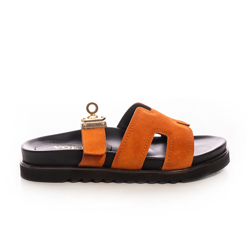 Design și MaterialeSandalele sunt confecționate din piele întoarsă de înaltă calitate, oferind o textură moale și plăcută la atingere. Culoarea vibrantă adaugă o notă de prospețime oricărei ținute, iar designul cu detalii metalice aurii conferă un aer sofisticat și modern.