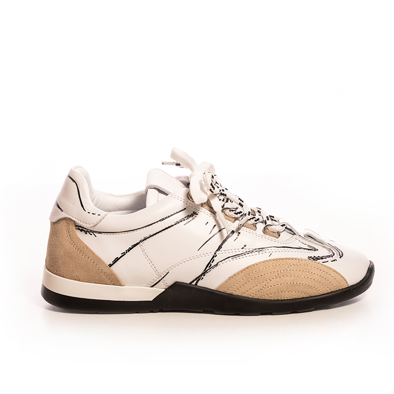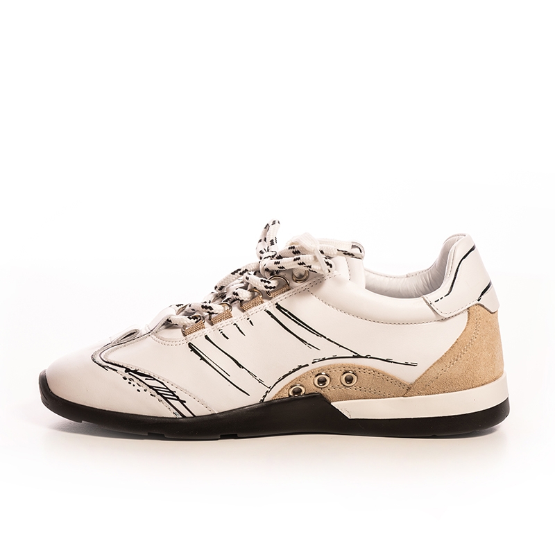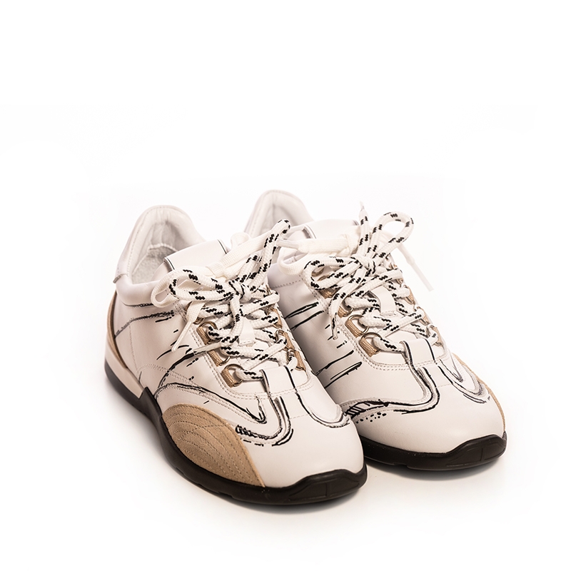 Design Rafinat: Culoarea albă dominantă este completată de detalii bej subtile, adăugând o notă de căldură și rafinament. Accentele grafice negre, stilizate, conturează forma pantofului, oferind un aer artistic și contemporan. Acești adidași sunt ideali pentru femeile care doresc să iasă în evidență printr-un stil unic și personal.