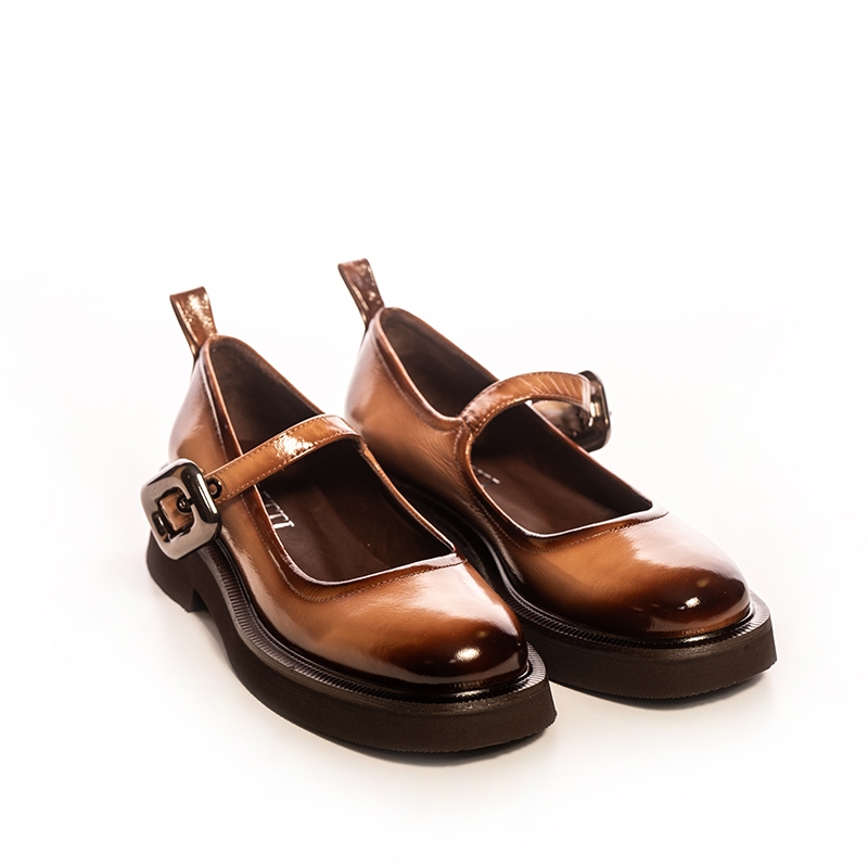 Acești pantofi combină elemente clasice cu un twist contemporan. Culoarea maro bogată, accentuată de finisajul lucios, oferă versatilitate și eleganță. Catarama metalică, poziționată strategic, adaugă un plus de stil și personalitate, transformând o pereche simplă de pantofi într-o declarație de modă.