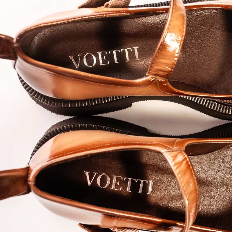 Adaugă un strop de eleganță modernă garderobei tale cu acești pantofi maro lucios!
