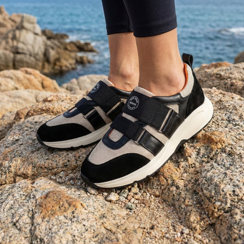 Sistem de închidere practic: Sistemul de închidere cu benzi velcro nu doar că adaugă un plus de stil, dar este și extrem de practic, permițând o încălțare și o descalțare rapidă și ușoară. Acesta asigură, de asemenea, o fixare sigură și ajustabilă pe picior.